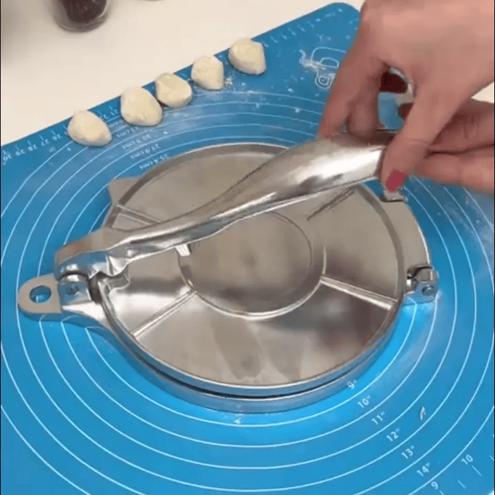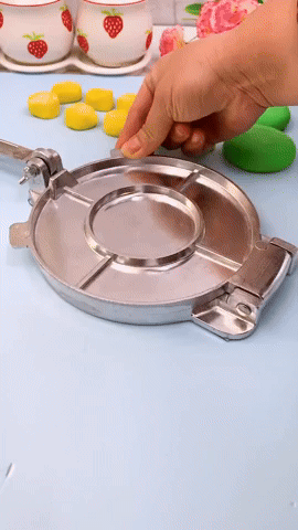 1. Coloca la masa → Forma una bolita de masa y ponla al centro de la prensa.